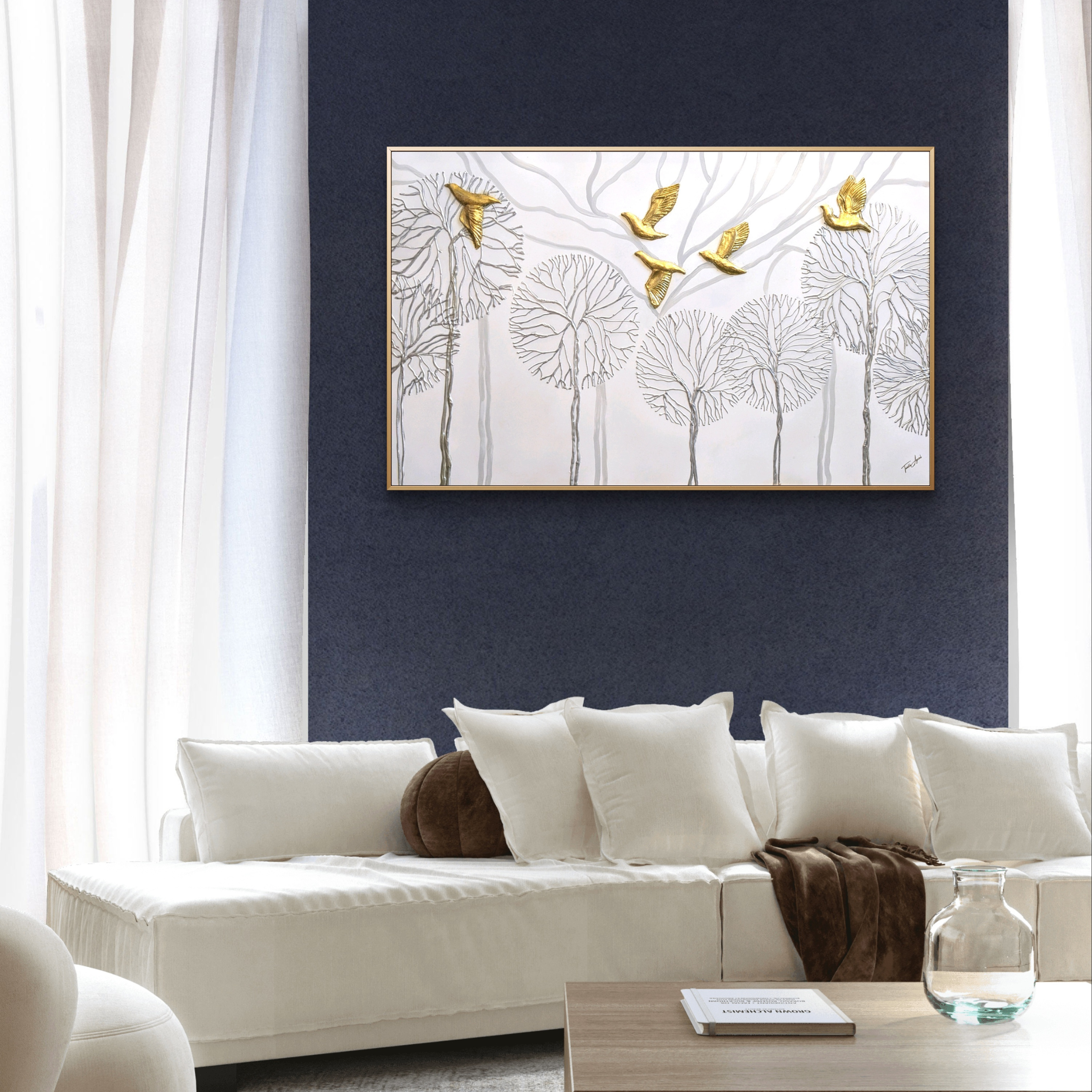 Description: Golden birds in mid-flight over textural cotton fields, a dramatic and ethereal visual.