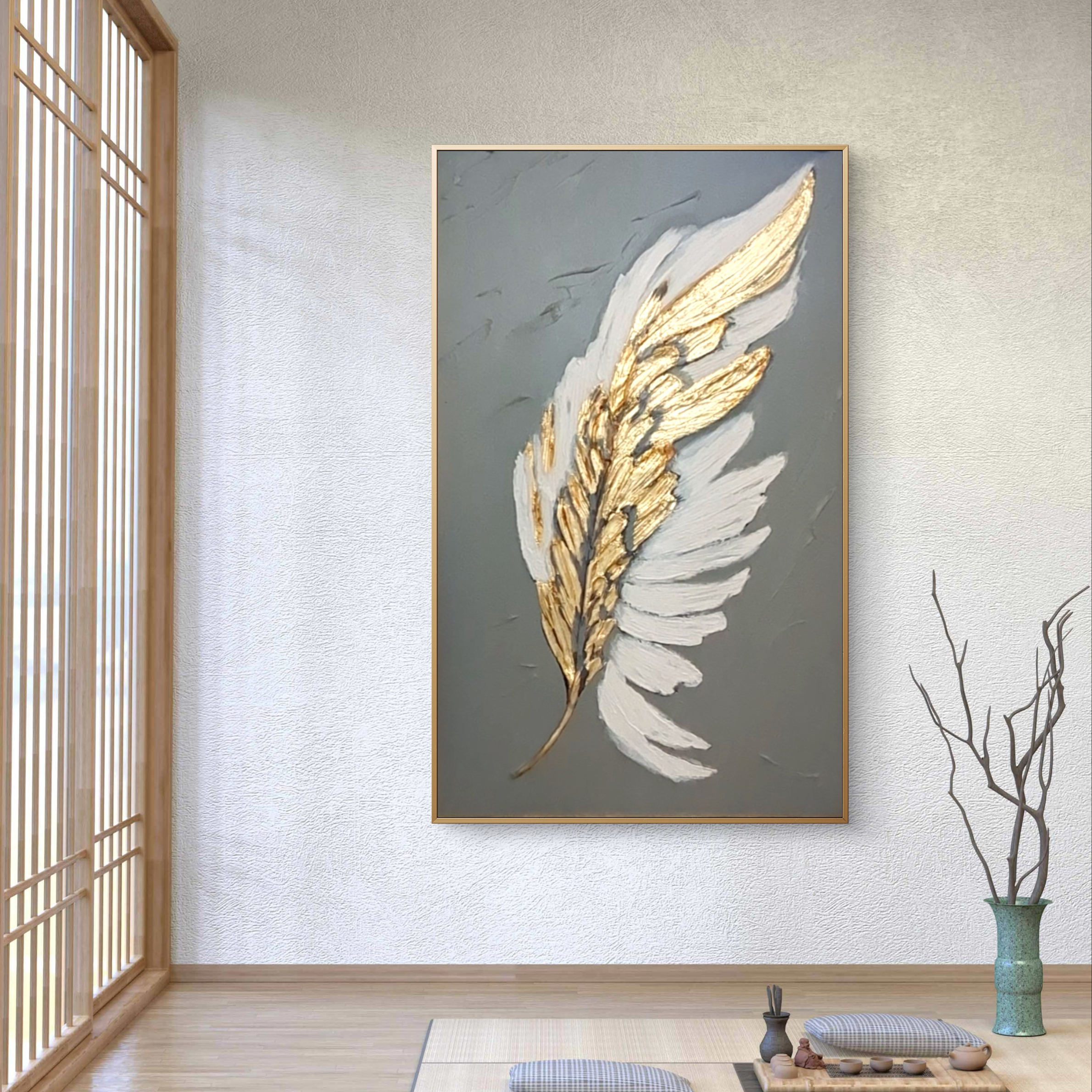 Description: A white ascending feather with gold accents, embodying growth, luxury, and peace.