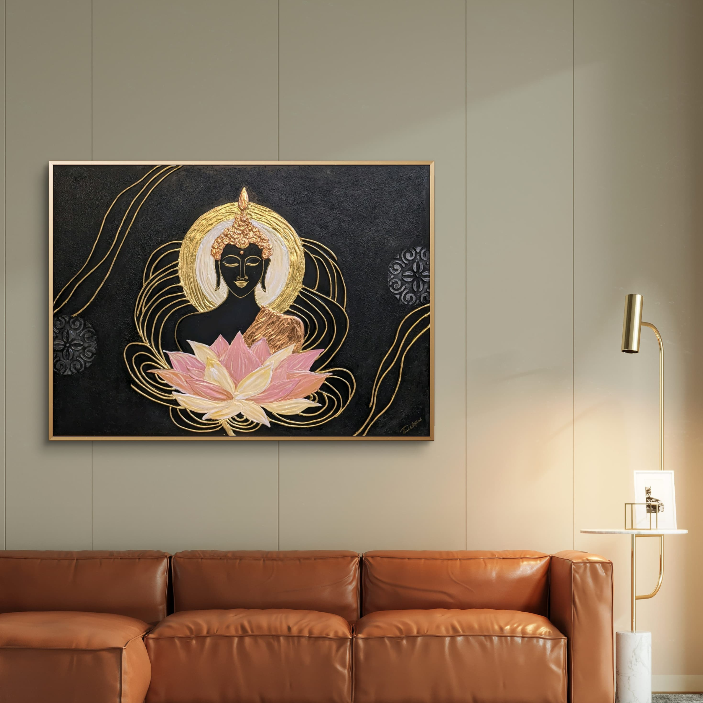 Description: A meditative Buddha on a radiant golden lotus, invoking calm and soulful elegance.