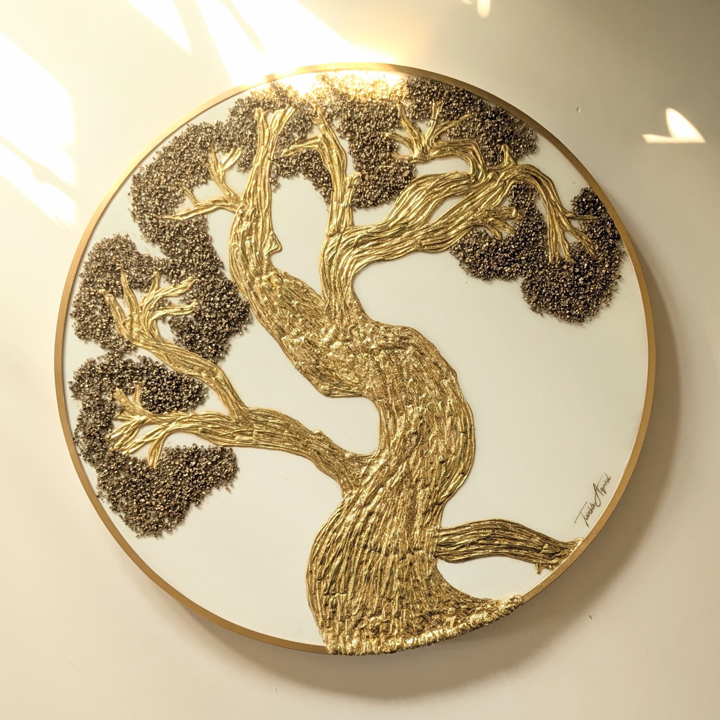 Medium: Epoxy resin, heavy POP texture, quartz stones, gold leaf