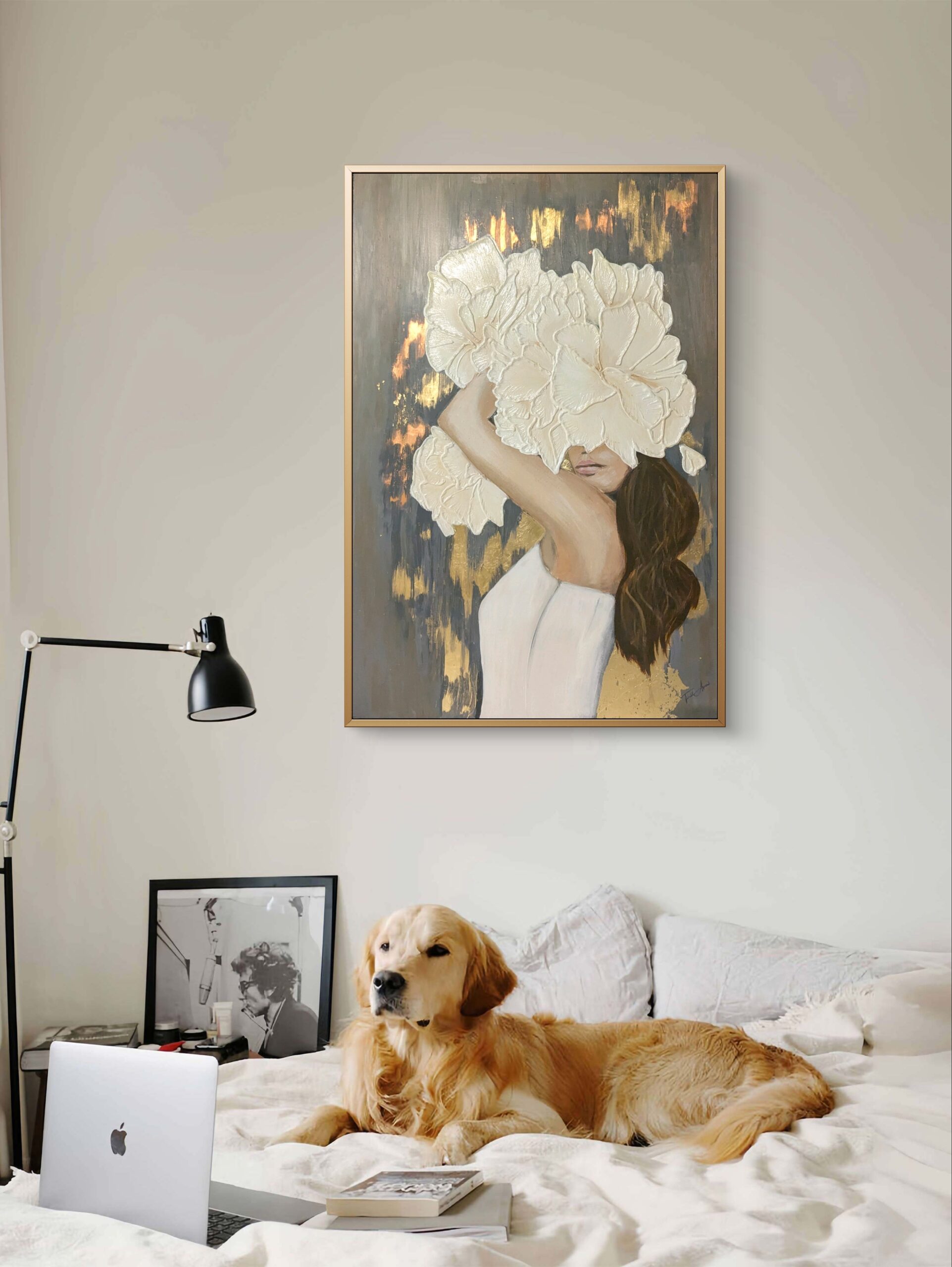 Description: A divine feminine portrait with blooming peonies and shimmering gold accents.